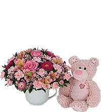 Este delicado arreglo incluye flores de estacion, Peluche y como recuerdo le quedara una bonita taza a quien lo reciba