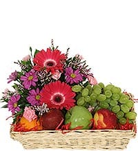 Canasta con las mas ricas frutas de estacion y las flores mas lindas