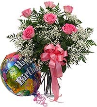 Hermoso arreglo con 6 delicadas rosas y globo de felicidad
