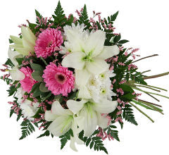 Mix de flores blancas con touch de gerberas de color y verdes en delicados papaeles de regaleria