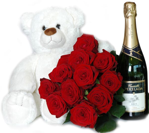 Con este combo unico de Peluche de 40 cm, 12 rosas y exquisito Champagne